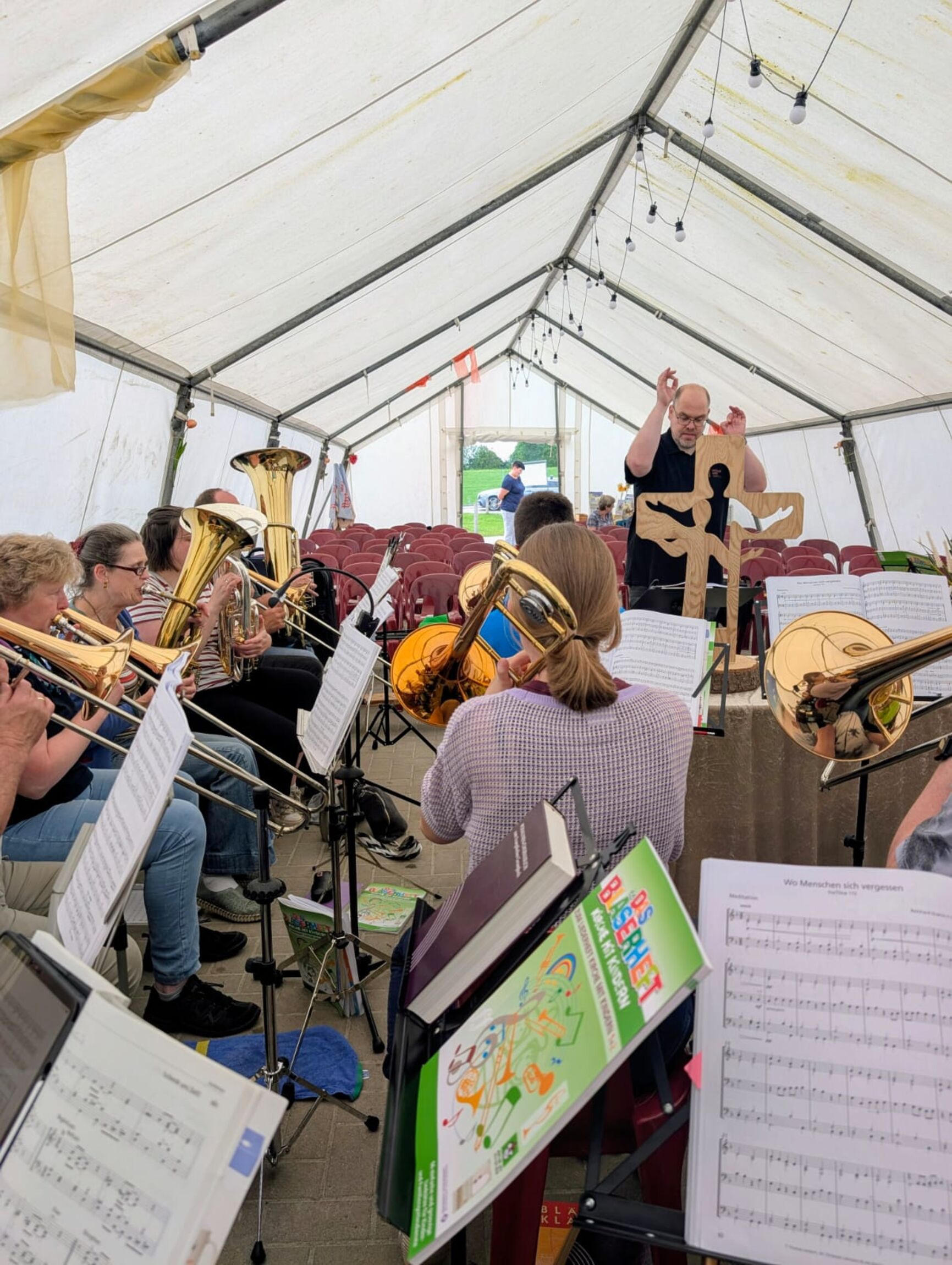 Für den 20. Juli hatte sich in diesem Jahr zunächst kein kompletter Posaunenchor gefunden, der den Gottesdienst musikalisch begleiten konnte. Daher wandte sich Hayo Bunger an alle Bläser im Sprengel mit der Frage, ob sich Einzelbläserinnen und -bläser für einen Projektchor zusammenfinden würden. Tatsächlich meldeten sich 25 motivierte Musiker aus Meppen, Rhauderfehn, Aurich, Norden und Norderney.