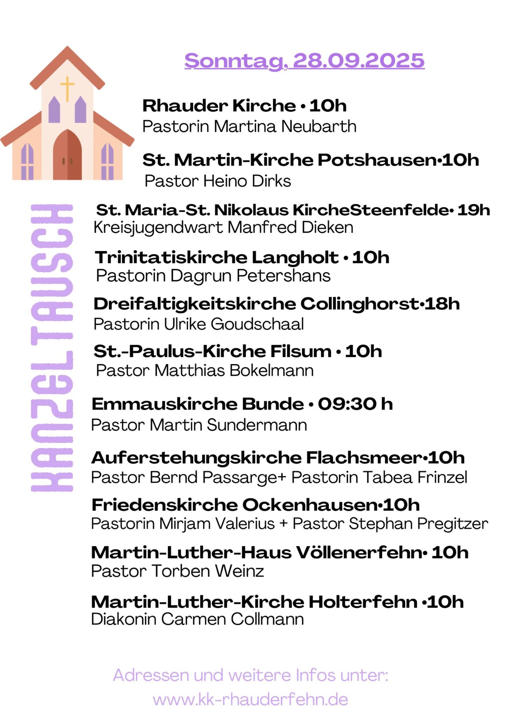 Rhauderfehn. Am kommenden Sonntag, den 28. September, findet im Kirchenkreis ein Kanzeltausch statt. Wo immer es möglich ist, übernehmen Pastorinnen und Pastoren aus anderen Gemeinden die Gestaltung des Sonntagsgottesdienstes. So entstehen neue Impulse, frische Gedanken und Begegnungen mit neuen Gesichtern.