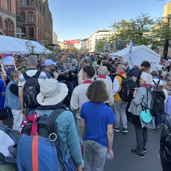 Die Stimmung war gelöst, erste Gespräche über das vielseitige Programm wurden in Hannover war das Flair des Kirchentags sofort spürbar: Viele Zelte und Stände rund um den Hauptbahnhof wiesen auf die logistische Größe der Veranstaltung hin. Auch die Verteilung der Liederhefte zeigte – hier geht es nicht nur um Organisation, sondern auch um gemeinsames Erleben und Mitsingen.
