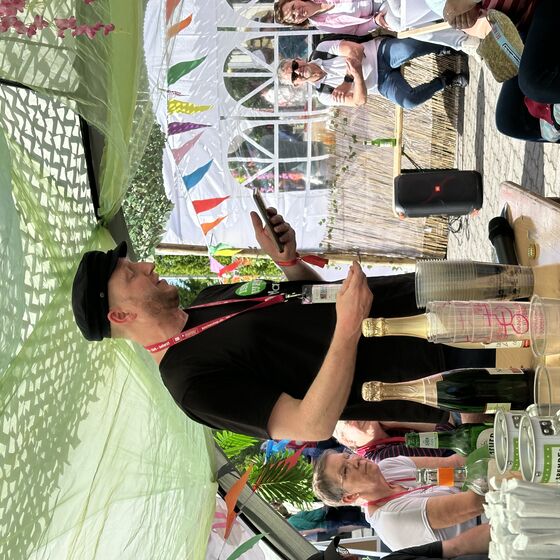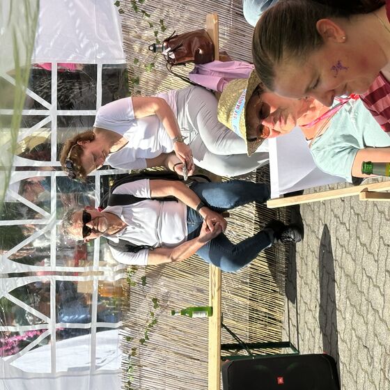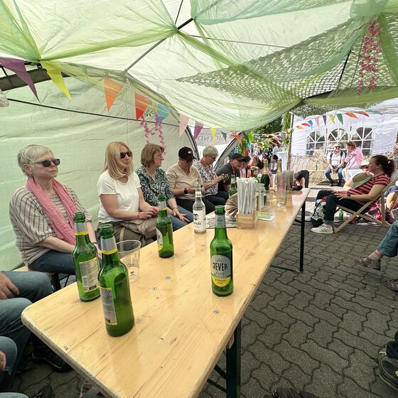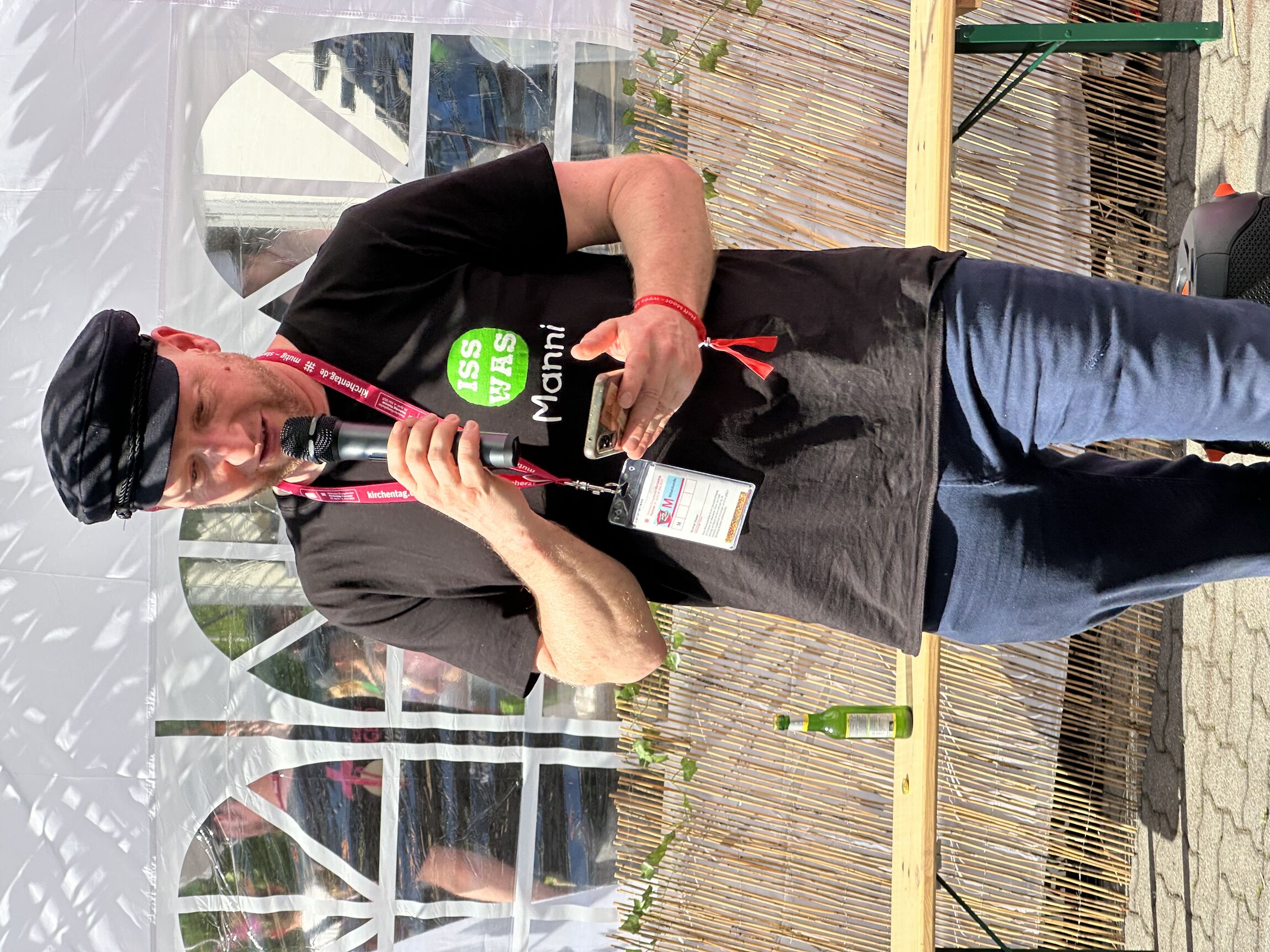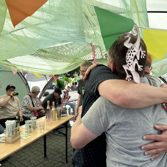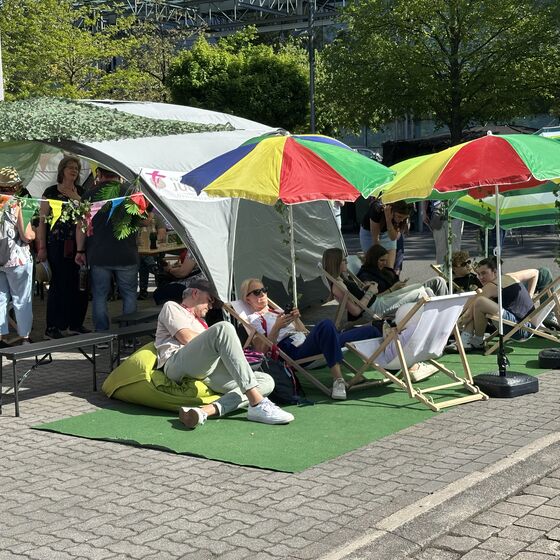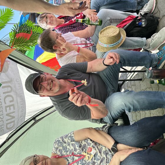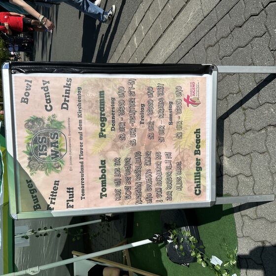 Am Nachmittag dann lud unser Kirchenkreis zu einem Empfang des Kirchenkreisjugenddienstes auf dem Messegelände ein. Zentrum des Geschehens: der „Iss-Was-Wagen“, der mit durchgehend hoher Nachfrage glänzte. Eine lange Schlange zeugte von der Beliebtheit des Angebots, das von engagierten Jugendlichen mit Ausdauer und Herz betreut wurde. Unter Sonnenschirmen, auf Liegestühlen oder Sitzsäcken nutzten viele Menschen die Gelegenheit, kurz zu verweilen und Kraft zu tanken.