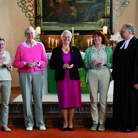 Superintendent Kersten würdigte die sehr besondere Arbeit der Frauen und zeichnete sie mit der höchsten Auszeichnung der Landeskirche, mit dem silbernen Facettenkreuz, aus. Er betonte: „Heute sagen wir Danke. Danke für allen treuen Dienst, für Ihren Glauben und für die Freude und den Trost, den sie anderen haben über Jahrzehnte lang zukommen lassen. Der Kirchenkreis ist Ihnen allen zu großem Dank verpflichtet. Sie haben mit Herzen, Mund und Händen geleitet und dabei angepackt, getragen, aufgebaut, ermutigt und gestaltet.“