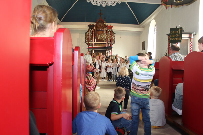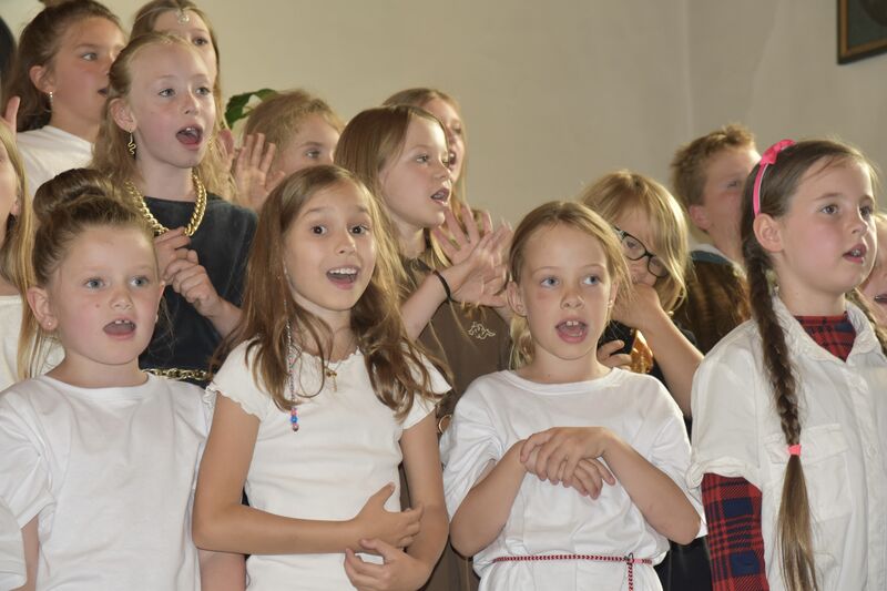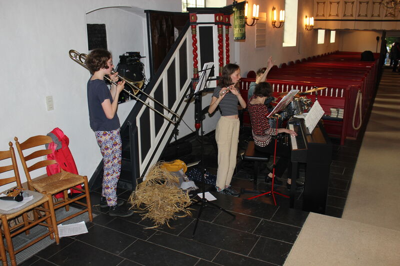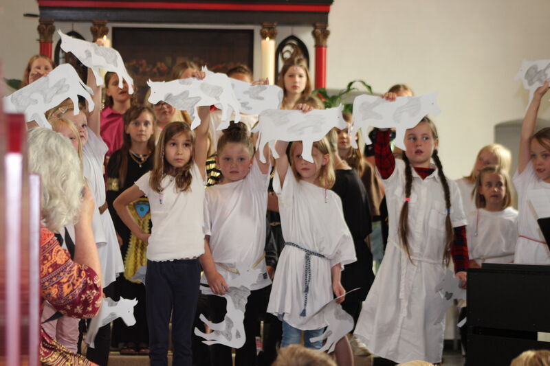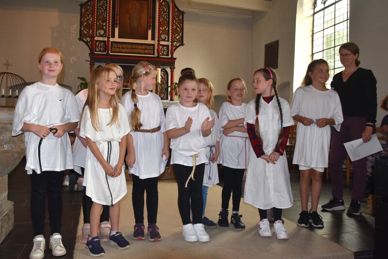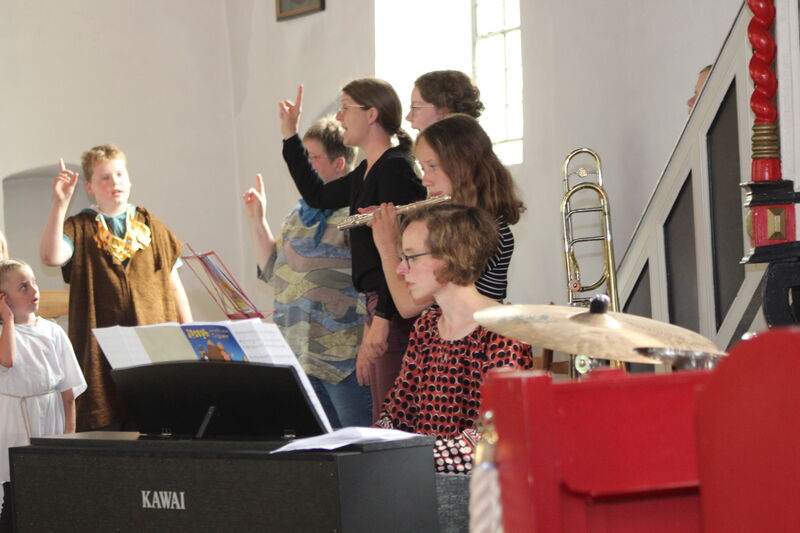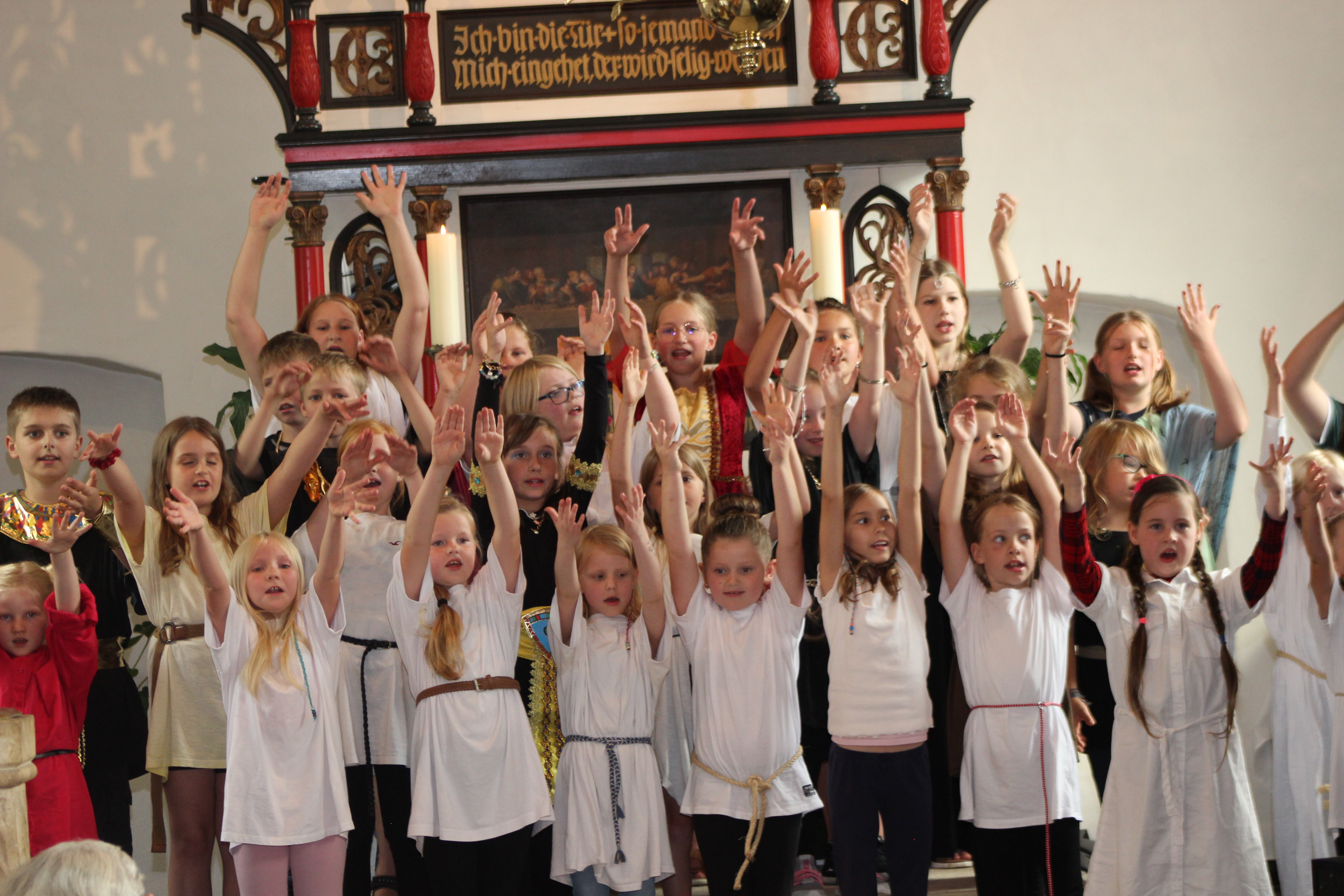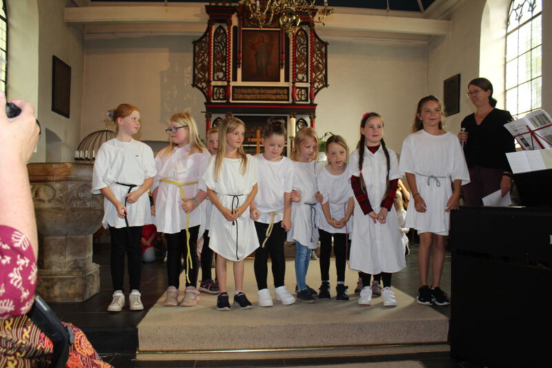 Es war schön mitzuerleben, wie die 30 Kinder mit Begeisterung bei der Sache waren und stimmgewaltig als großer Chor und auch in den Solopartien schon selbstbewusst ihre schmissigen Lieder vortrugen. Begleitet wurden sie dabei von einer kleinen Band, bestehend aus Klavier (Elisabeth Jochim), Querflöte (Frieda Schmidt) Posaune (Elske Schmidt) und Schlagzeug (Justin Frey).