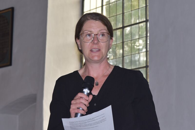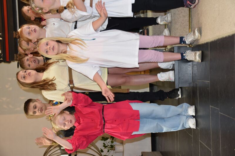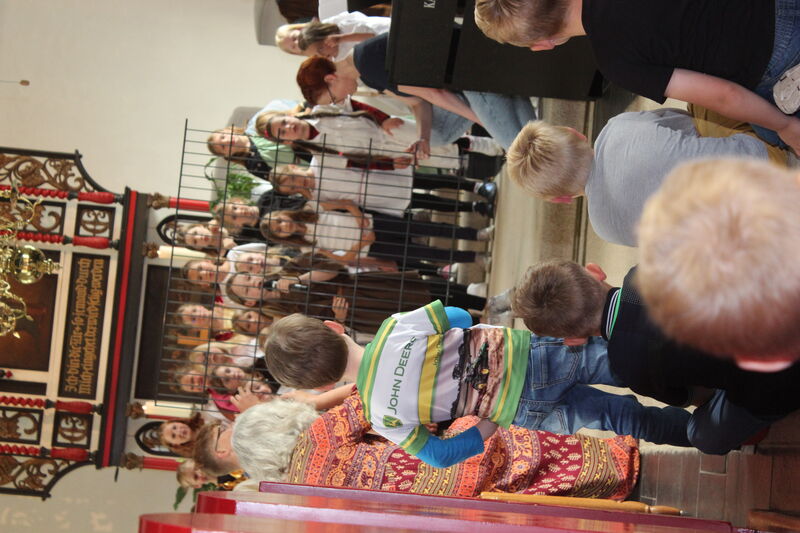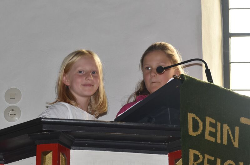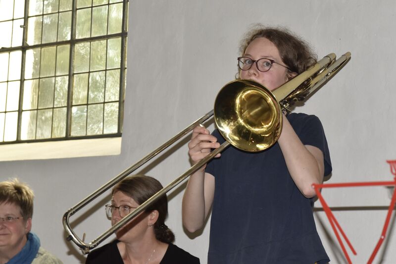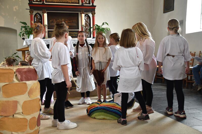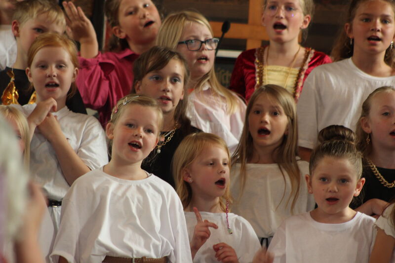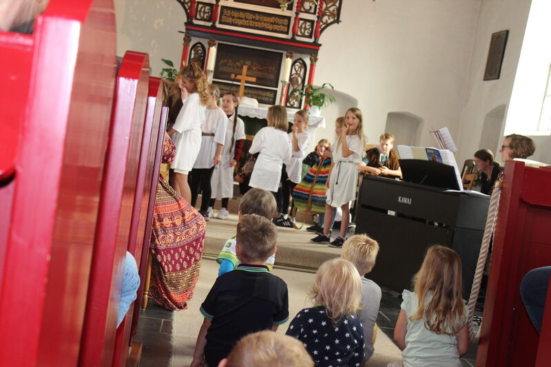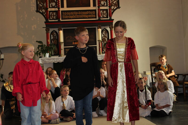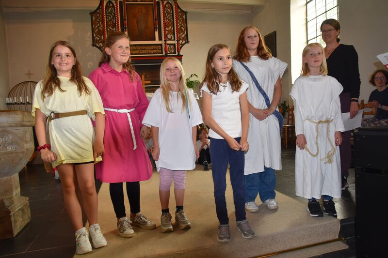 Es war schön mitzuerleben, wie die 30 Kinder mit Begeisterung bei der Sache waren und stimmgewaltig als großer Chor und auch in den Solopartien schon selbstbewusst ihre schmissigen Lieder vortrugen. Begleitet wurden sie dabei von einer kleinen Band, bestehend aus Klavier (Elisabeth Jochim), Querflöte (Frieda Schmidt) Posaune (Elske Schmidt) und Schlagzeug (Justin Frey).
