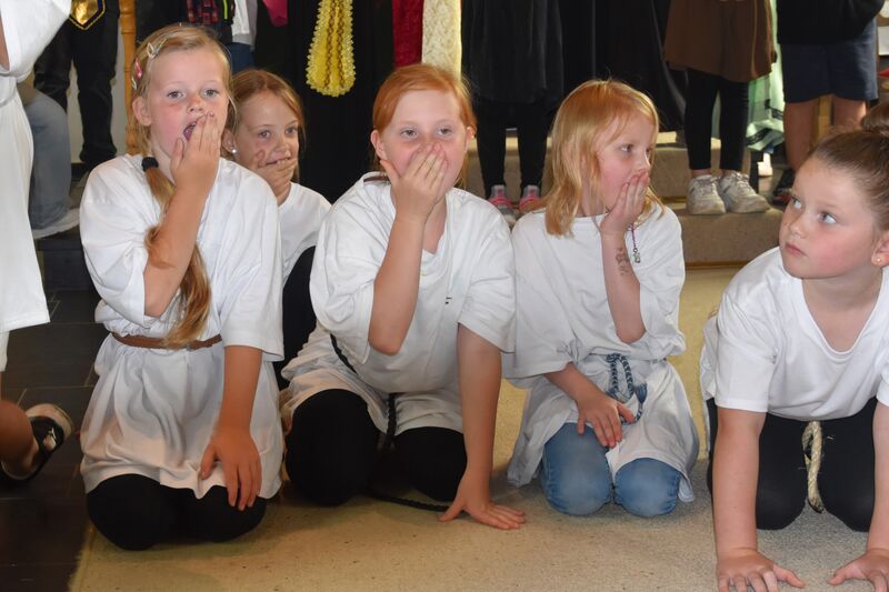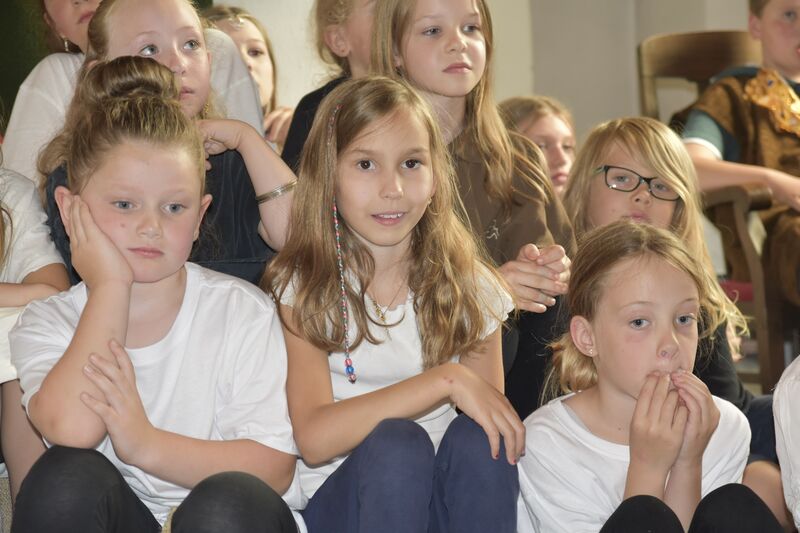 Teamerinnen und Teamer fungierten unauffällig als Einsatzgeber, Souffleuse und von der Seite der Bühne und begeisterte Kinder knieten, um ja nichts zu verpassen, am Bühnenrand, um Bruder oder Schwester in ihrer oder seiner neuen Rolle als Schauspieler und Chorsänger zu bestaunen.