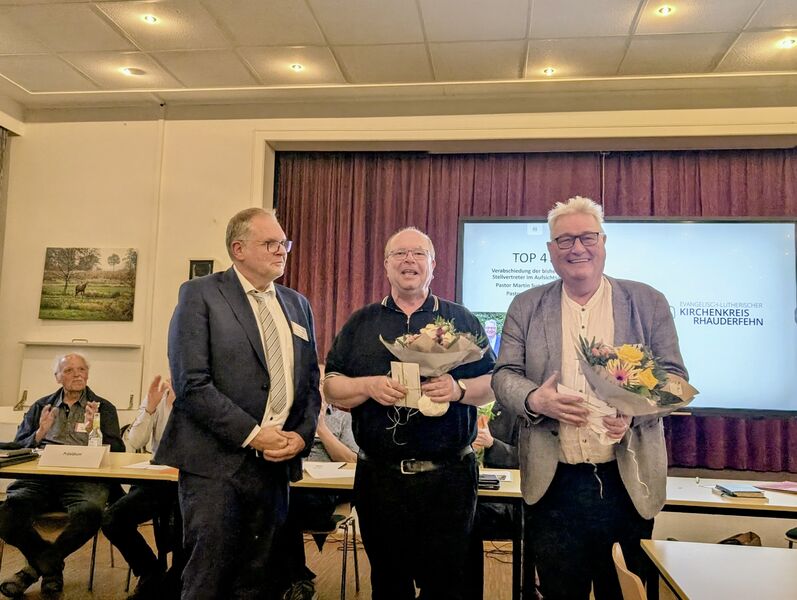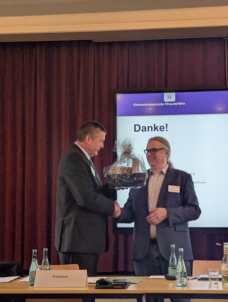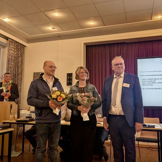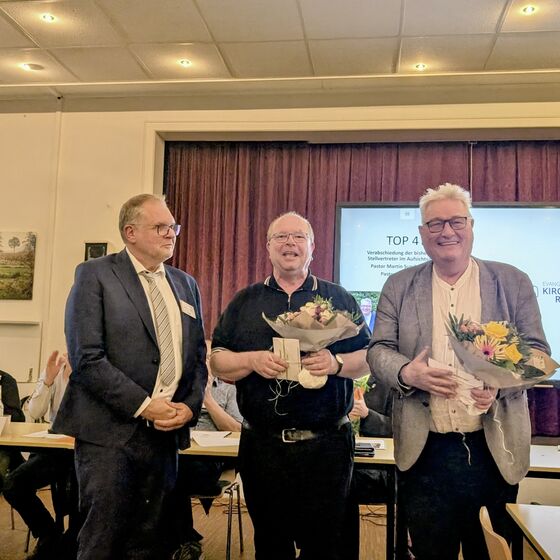 Im weiteren Verlauf wurden die bisherigen stellvertretenden Superintendenten Martin Sundermann und Heino Dirks feierlich verabschiedet.„Ich danke Euch für euren treuen und verlässlichen Dienst sowie alle vertrauensvolle Zusammenarbeit in den letzten Jahren“, führte Kersten aus. Als neue Stellvertretung des Superintendenten wurden Pastorin Mirjam Valerius aus Steenfelde und Pastor Torben Weinz aus Collinghorst einstimmig durch die Synode bestätigt.