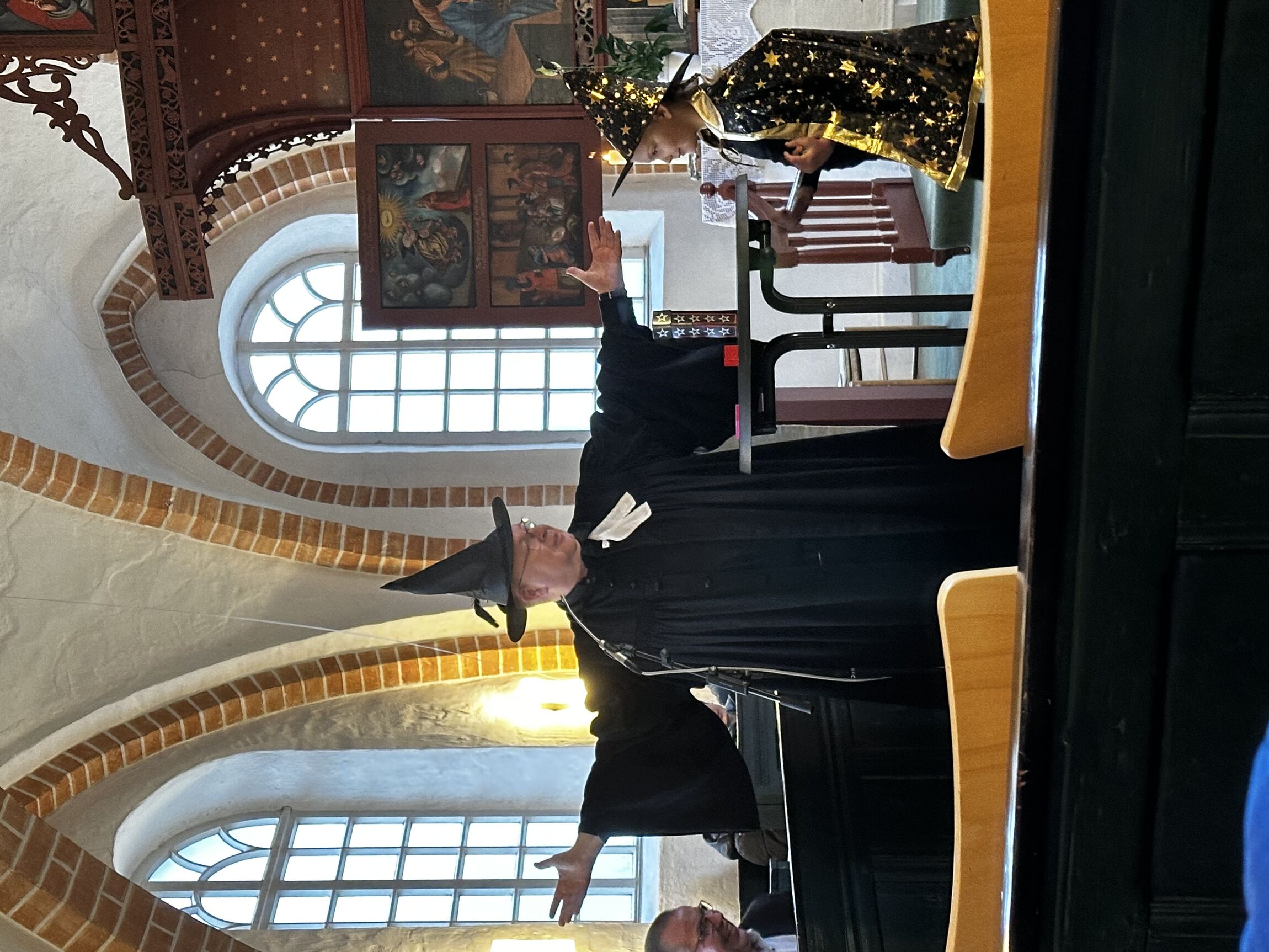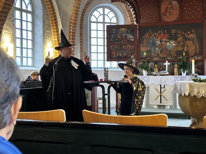Kurz darauf betrat der „große Zauberer Pastorelli“ die Bühne – eine Rolle, in die Pastor Heino Dirks selbst schlüpfte. Unterstützt wurde er von seiner Assistentin Leevke. Gemeinsam präsentierten sie mehrere Zauberkunststücke, die für große Freude und staunende Gesichter im Publikum sorgten. Musikalisch ergänzt wurde dieser Teil durch das Lied „Wärst du ein Zauberer“ von Herman van Veen.